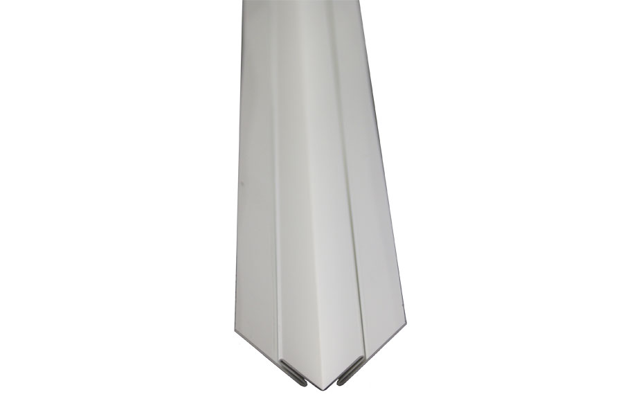 The inside corner trim molding is made from our .040” 3105-H14 white aluminum sheet stock. Inside corner trim molding is used to join two sheets at 90° on an inside corner. The pocket for each side is ¾”, and subtracting 7/8” from the sheet size will accommodate for this trim.